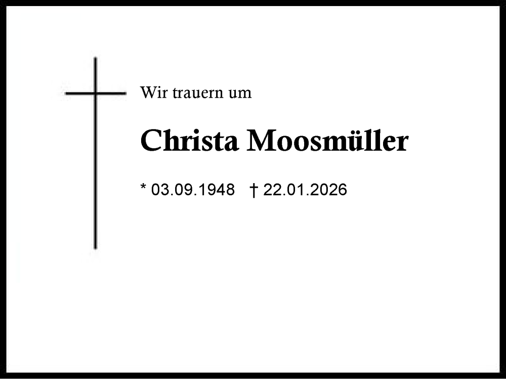 Hier finden Sie alle Traueranzeigen aus der Zeitung, die bisher für Christa Moosmüller erschienen sind. Weitere Traueranzeigen, die in der Zeitung erscheinen, werden hier ebenfalls aufgelistet
