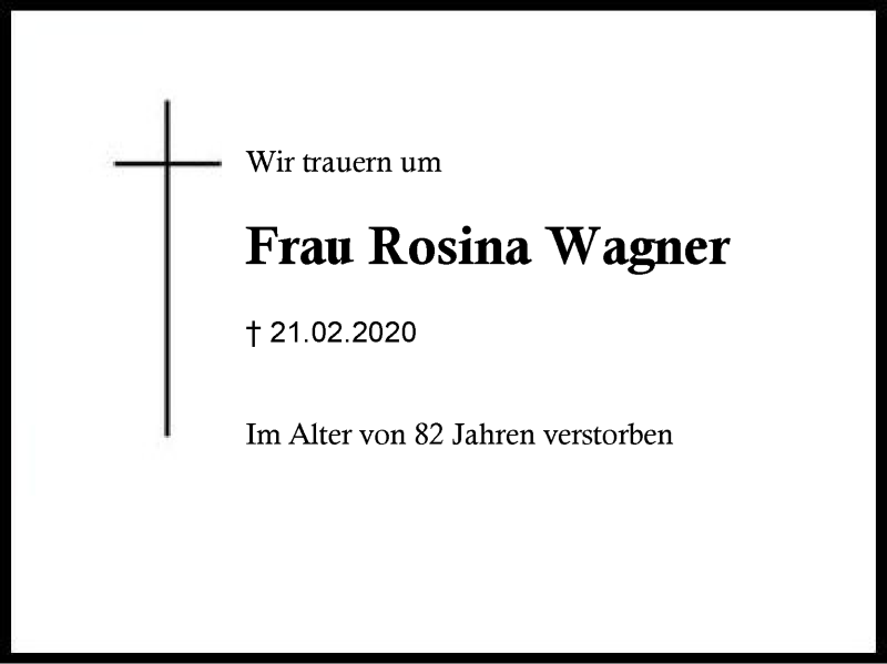 Hier finden Sie alle Traueranzeigen aus der Zeitung, die bisher für Rosina Wagner erschienen sind. Weitere Traueranzeigen, die in der Zeitung erscheinen, werden hier ebenfalls aufgelistet